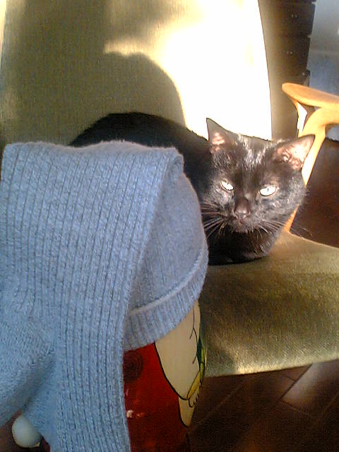 黒豹さんはいすの上に飛び乗って、グルコをじいっと見つめたままだよ。